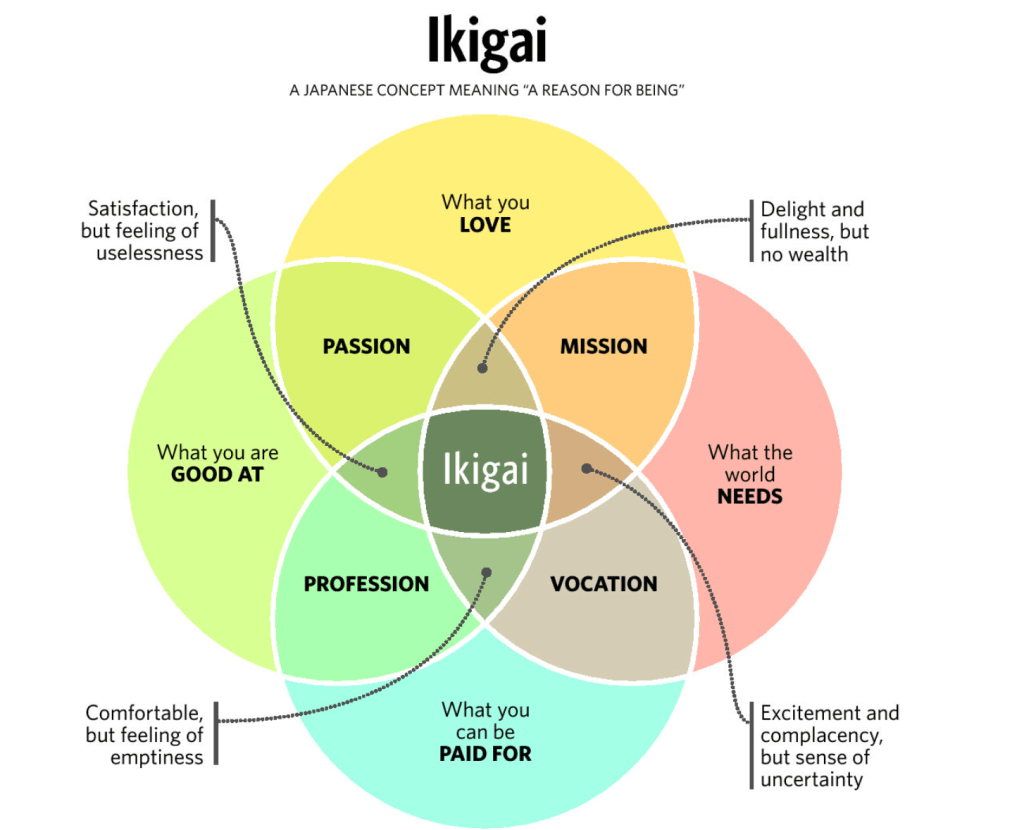 So, what’s your Ikigai? Use this concept to explore the overlap between what you love, what you’re good at, what the world needs, and what you can be paid for. Draw your own version of the overlapping circles of the Ikigai symbol and reflect on your passions, skills, mission, and profession. Allow yourself the space for your true purpose to emerge naturally.